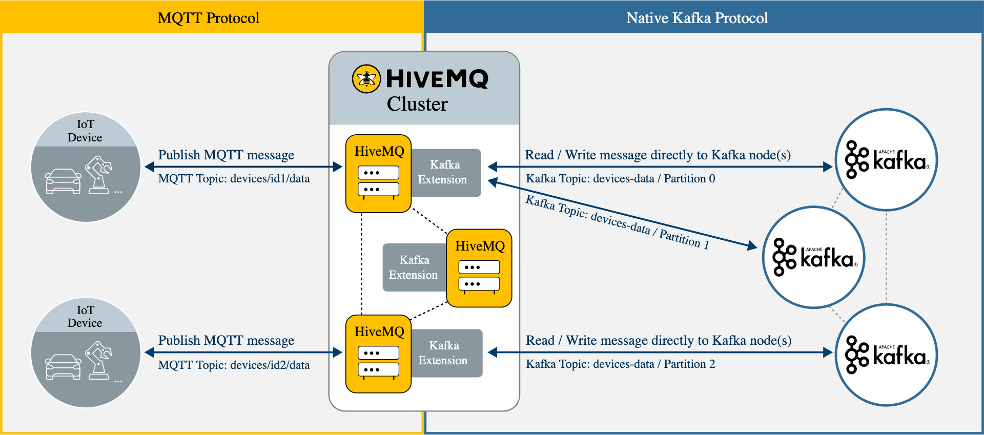 Rather than competing, HiveMQ and Kafka often complement each other in IoT architectures. HiveMQ offers the Enterprise Extension for Kafka, which implements the native Kafka protocol within the HiveMQ MQTT broker[4][10].