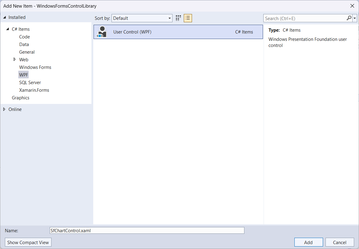 To host the WPF Chart control, a WPF User Control must be added to the Windows Control Library project. Follow these steps: