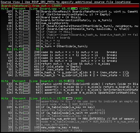 The entries in the table are sorted by file and then source line top to bottom (not by hit percentage). Hits in header files are likely functions inlined into the current one. Hits attributed to closing braces } are likely for time spent in destructors. Note that heavy compiler optimization can reduce the accuracy of address-to-line mappings from the debug information. The coloring of entries is based on the same percentage thresholds as all previous displays.