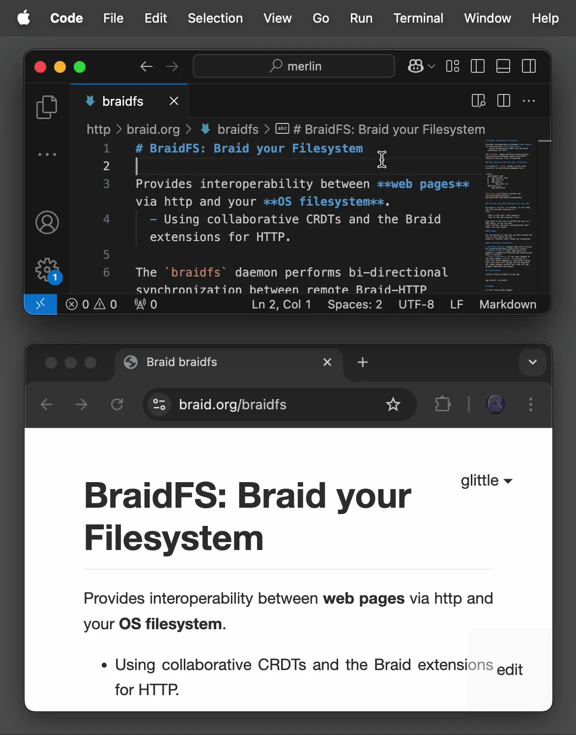Any synced page can be edited with your favorite local text editor—like VSCode, Emacs, Vim, Sublime, TextWrangler, BBEdit, Pico, Nano, or Notepad—and edits propagate live to the web, and vice-versa.
