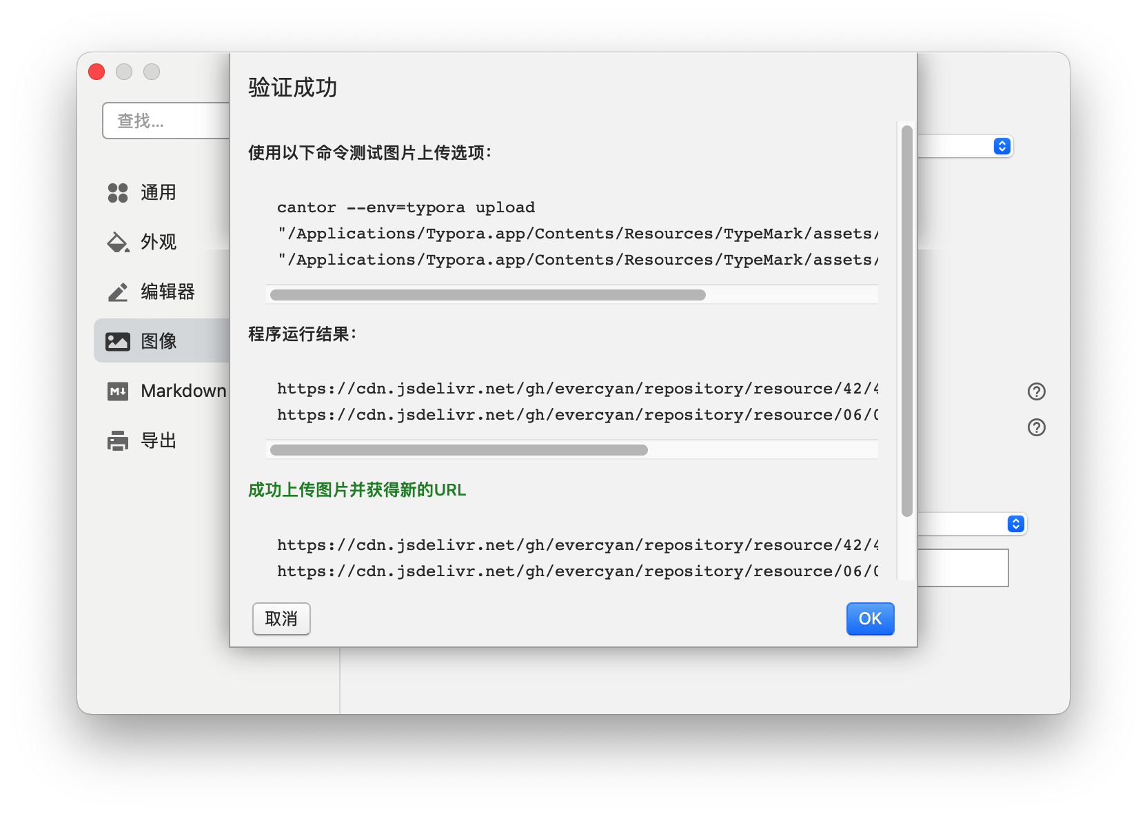 # 需要安装应用并完成 GitHub 图床相关配置才可在终端使用 # 安装 cantor 终端程序 go install github.com/evercyan/cantor/cmd/cantor@latest # 上传文件 cantor upload ~/demo.png ~/demo1.png # 安装终端程序后, 可在 typora 里如下图所示配置图片上传, 其他应用亦是同理