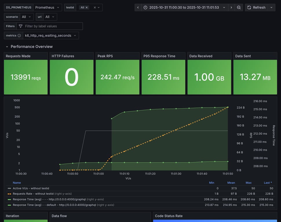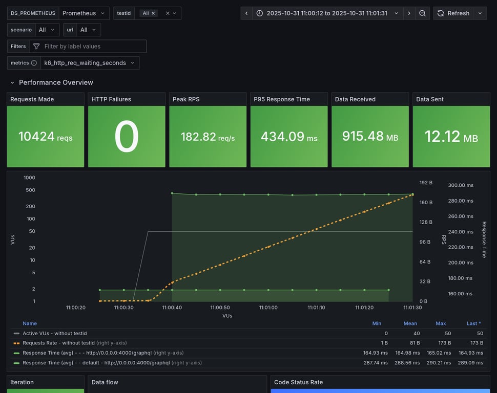 | apollo-gateway | 150 | 10365 total, 0 failed | avg: 1247ms, p95: 2610ms | ✅ |