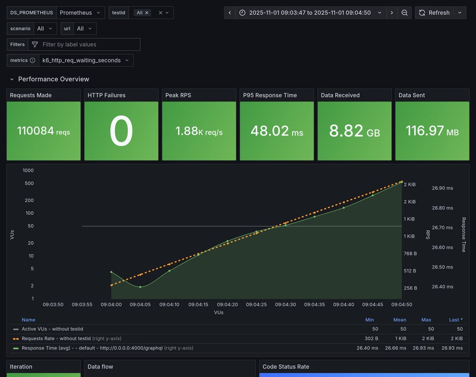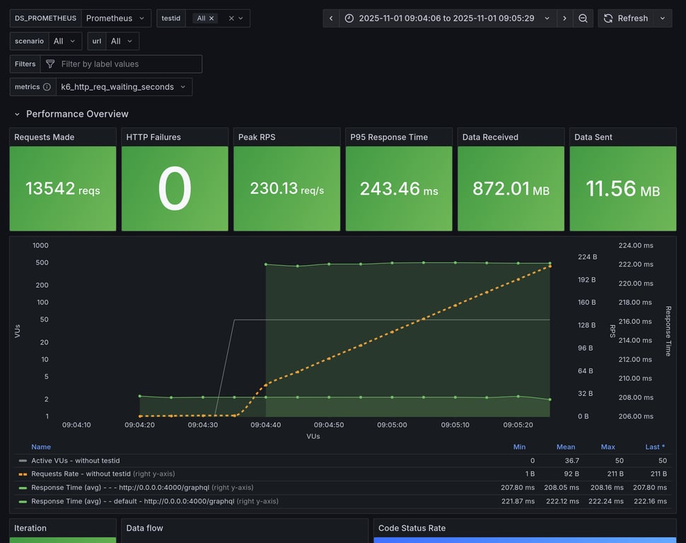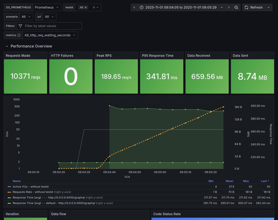 | apollo-router | 367 | 24781 total, 0 failed | avg: 569ms, p95: 1291ms | ❌ 14 unexpected GraphQL errors |
