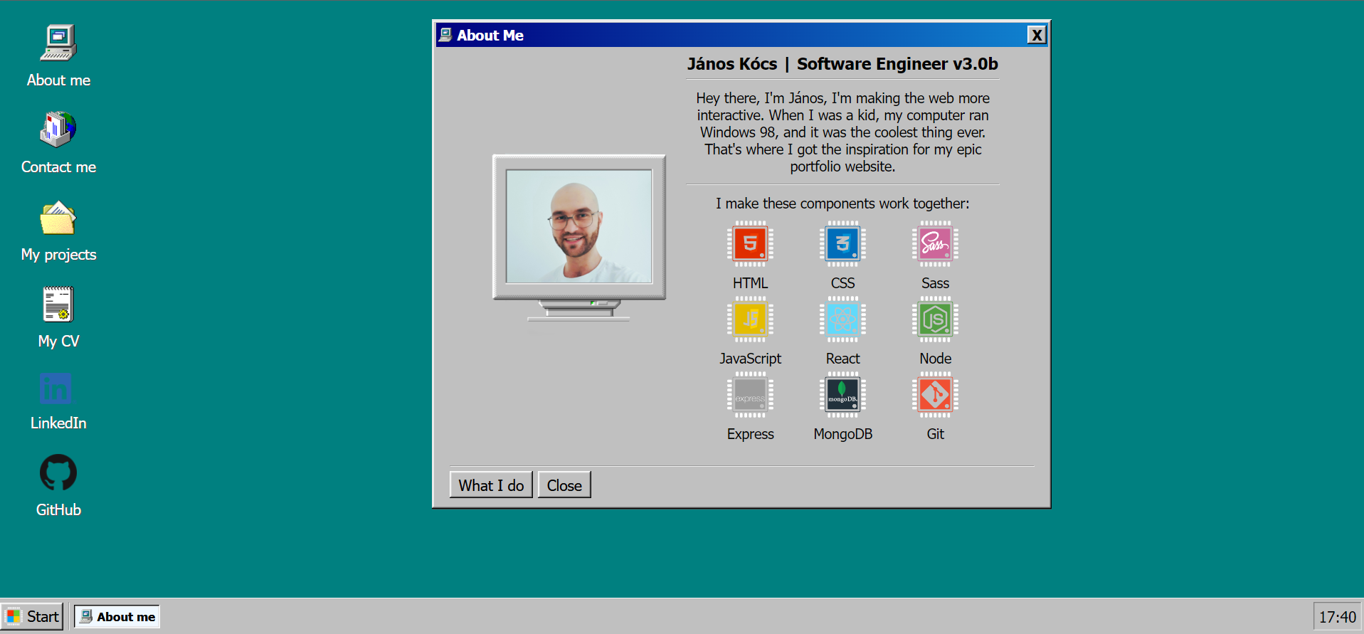 Checkout the source code for my portfolio site! My first computer had Windows 98 on it and I thought it was the coolest thing EVER. As I am going through a career change, I wanted to pay homage to Win98 as it really inspired me to build software. This is version 3.1; I completely rebuilt it from the ground up using React and Sass.