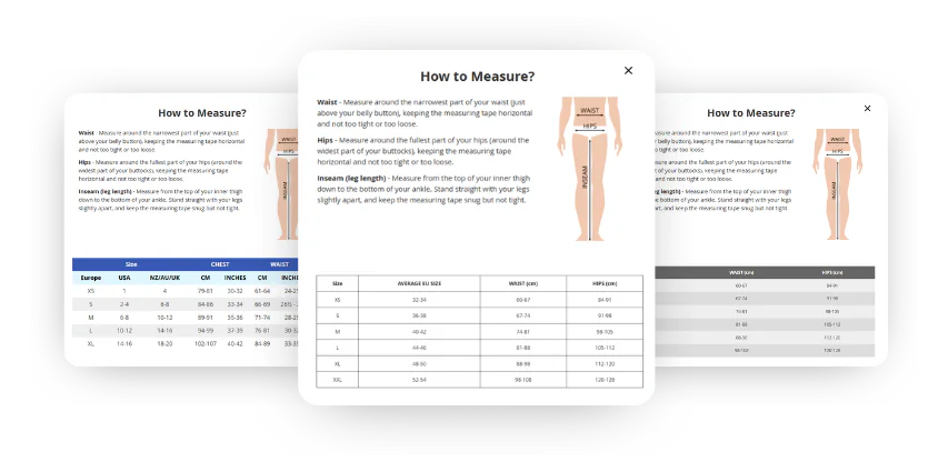 Display personalzied size charts on separate products or entire categories. Place size charts where people can find them - in popups or product tabs.